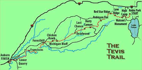 Beginning at the Robie Equestrian Park (elevation 7,000 feet), south of Truckee, California, the trail descends gradually approximately nine miles to the Truckee River at the Midway Crossing on Highway 89. The trail takes a route through Squaw Valley, the U.S. Olympic training facility and site of the 1960 Winter Olympics, and ascends from the valley floor (elevation 6,200 feet) to Emigrant Pass near Watson's Monument (elevation 8,750 feet), a climb of 2,550 vertical feet in 4½ miles. From the pass, following the trail once used by gold and silver miners during the 1850s and rediscovered by Robert Montgomery Watson in 1929, riders will travel west, ascending another 15,540 feet and descending approximately 22,970 feet before reaching the century-old town of Auburn via the traditional route through Robinson Flat, Last Chance, Deadwood, Michigan Bluff, Foresthill, and Francisco's.